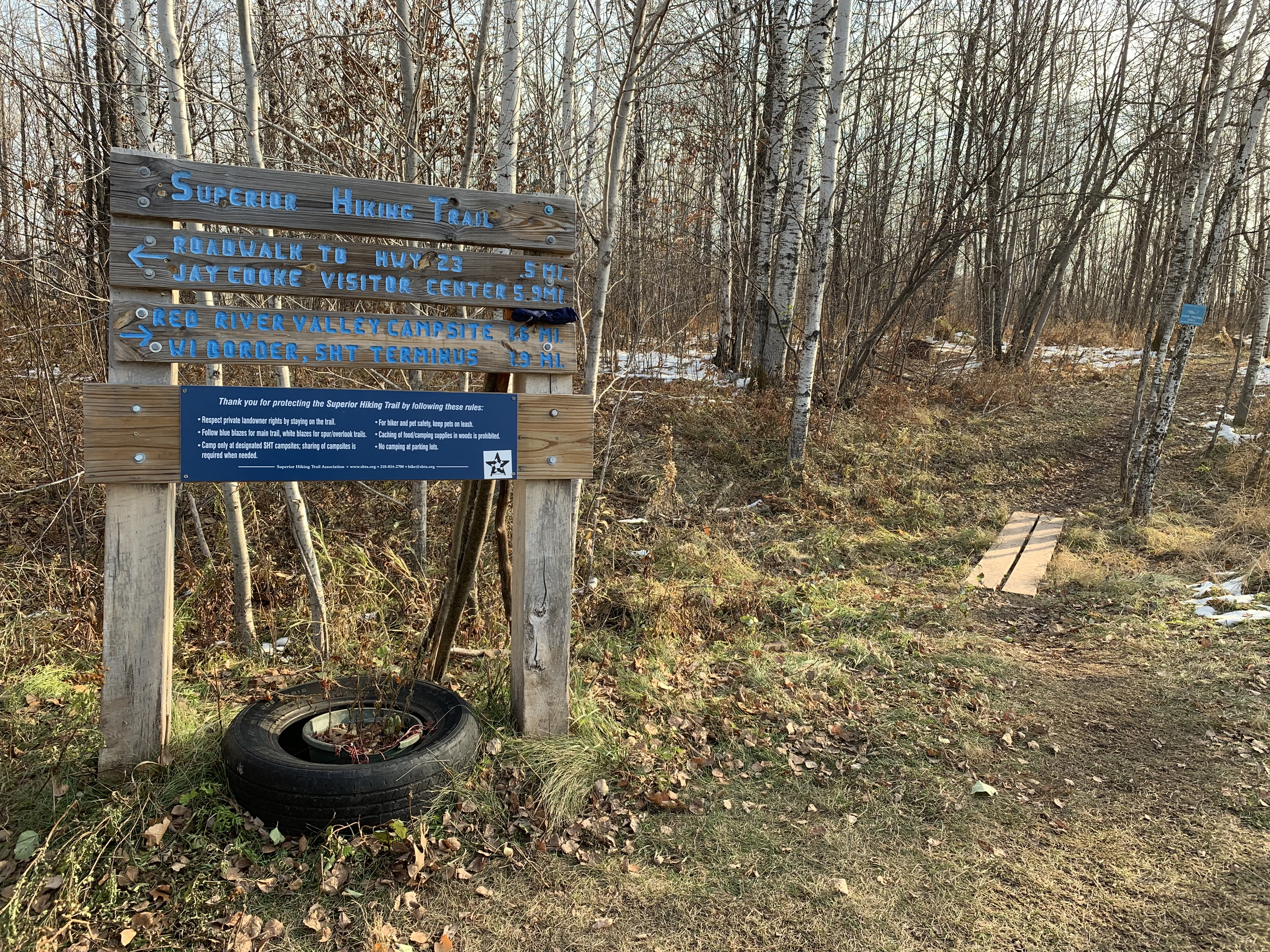 The ubiquitous mileage sign found at all Superior Hiking Trail trailheads.