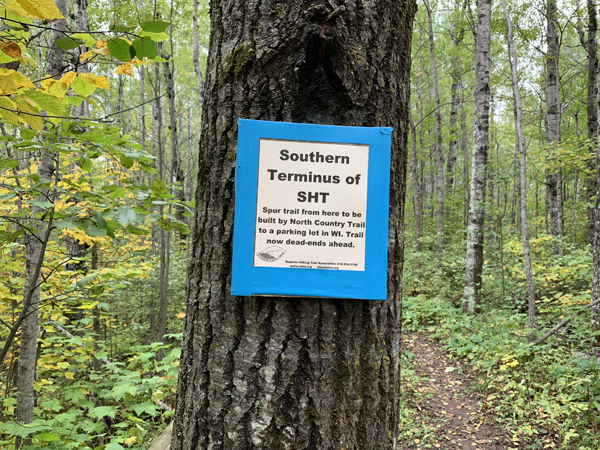 The southern end of the SHT. From here the trail continues into Wisconsin as the North Country National Scenic Trail (NCNST). The SHT is part of the NCNST in Minnesota.