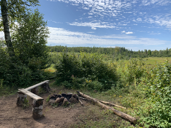 Another view of the fire pit. This spot overlooks a marshland visible in the background.