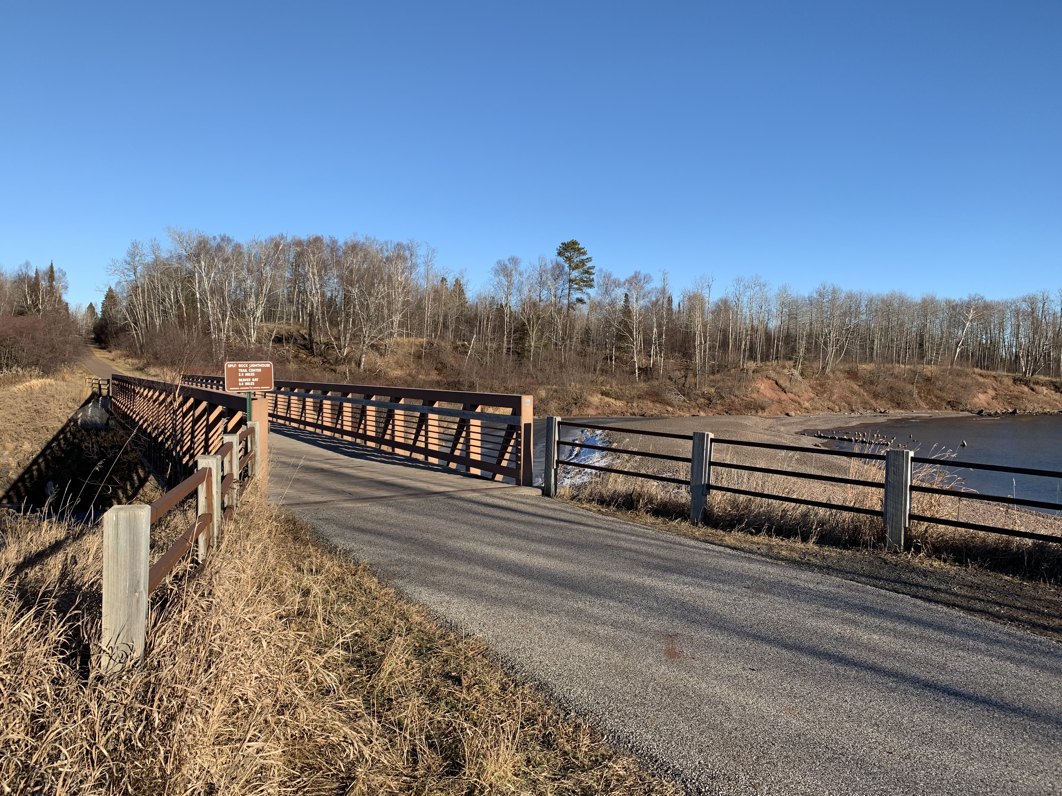 This section is currently a reroute (as of 2021). The section now mostly follows the Gitchi-Gami State Trail from Gooseberry Falls State Park to the Split Rock River Wayside Trailhead. Therefore, it is a paved trail. For a state trail, it is gets relatively light traffic. It runs close to Minnesota Highway 61, so there is substantial traffic noise in some places. However, the section does provide some awesome views of Lake Superior. Instead of following the Gitchi-Gami State Trail for the entire distance, it is possible to cross Minnesota Highway 61 at Blueberry Road and follow that road up to where the trail resumes. This would be the way to go if you need to camp, as the Blueberry Hill Campsite is located just east of Blueberry Hill Road once you resume travel on the main SHT path. Iona's Beach is a sand beach (rare on Lake Superior) that starts just north of the Iona's Beach Scientific and Natural Area.