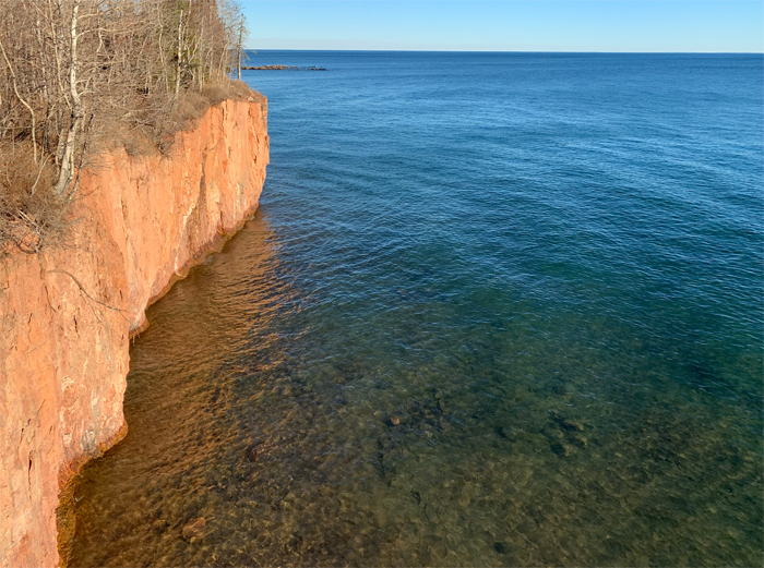 Mile 3.3 (section) Mile 115.1 (SHT): View of Lake Superior. View from bridge hanging over the edge of a cliff along the shoreline of Lake Superior.