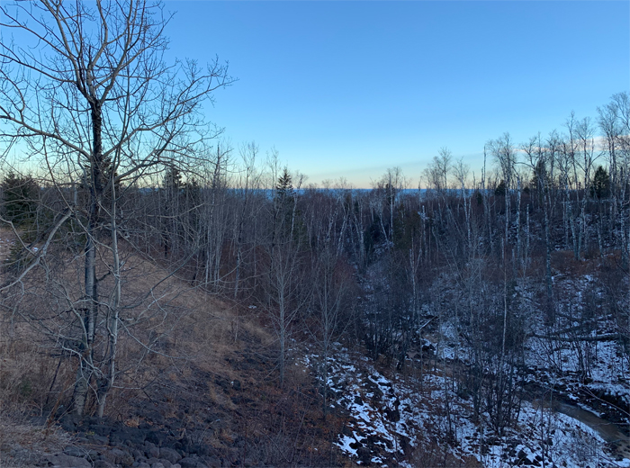 Mile 0.4 (section) Mile 112.2 (SHT): Nelsens Creek. Crossing Nelsens Creek. Lake Superior visible in the distance.