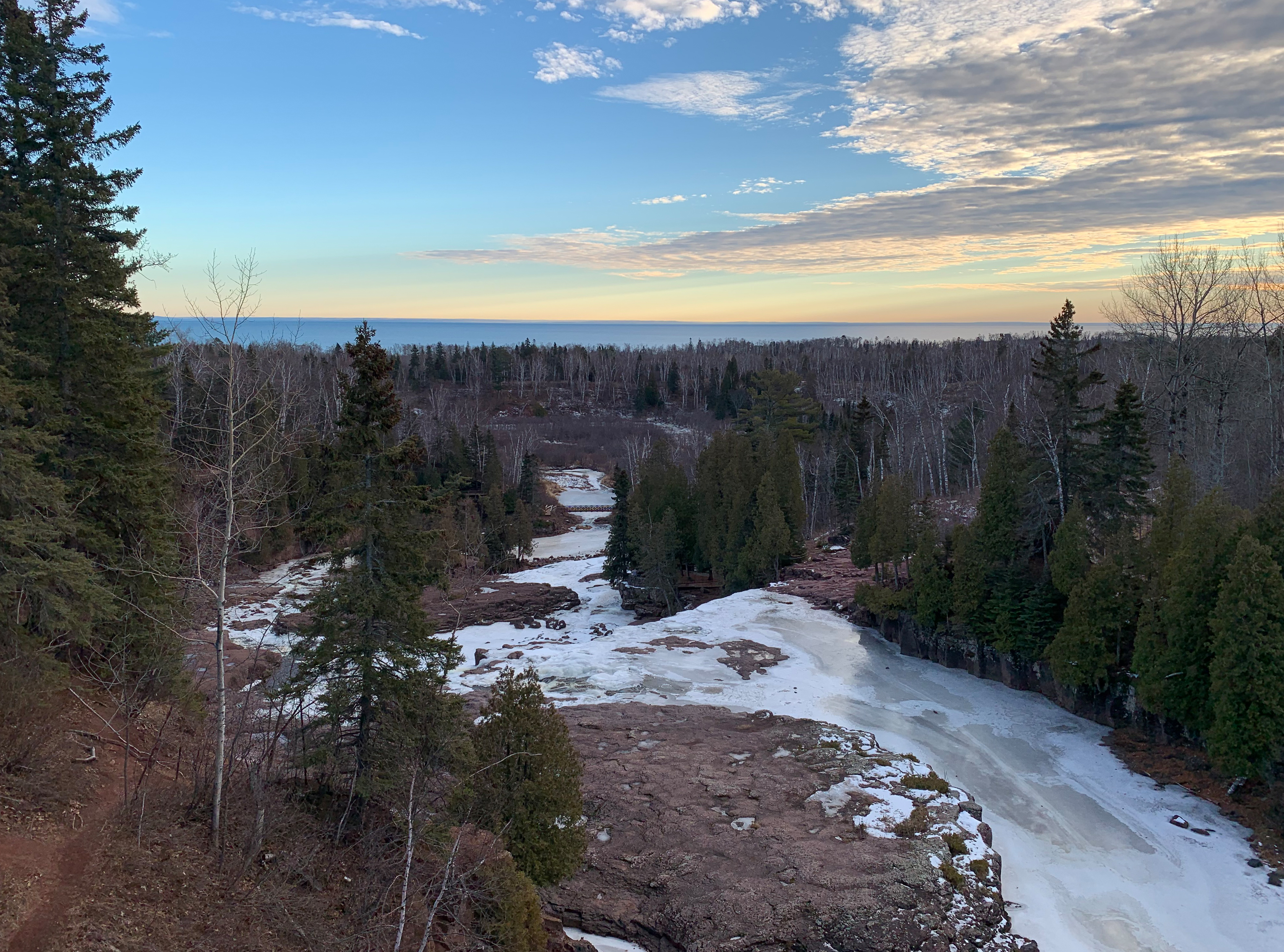 Mile 0.0 (section) Mile 111.8 (SHT): Frozen Gooseberry Falls. View of Gooseberry Falls from the Minnesota Highway 61 bridge.